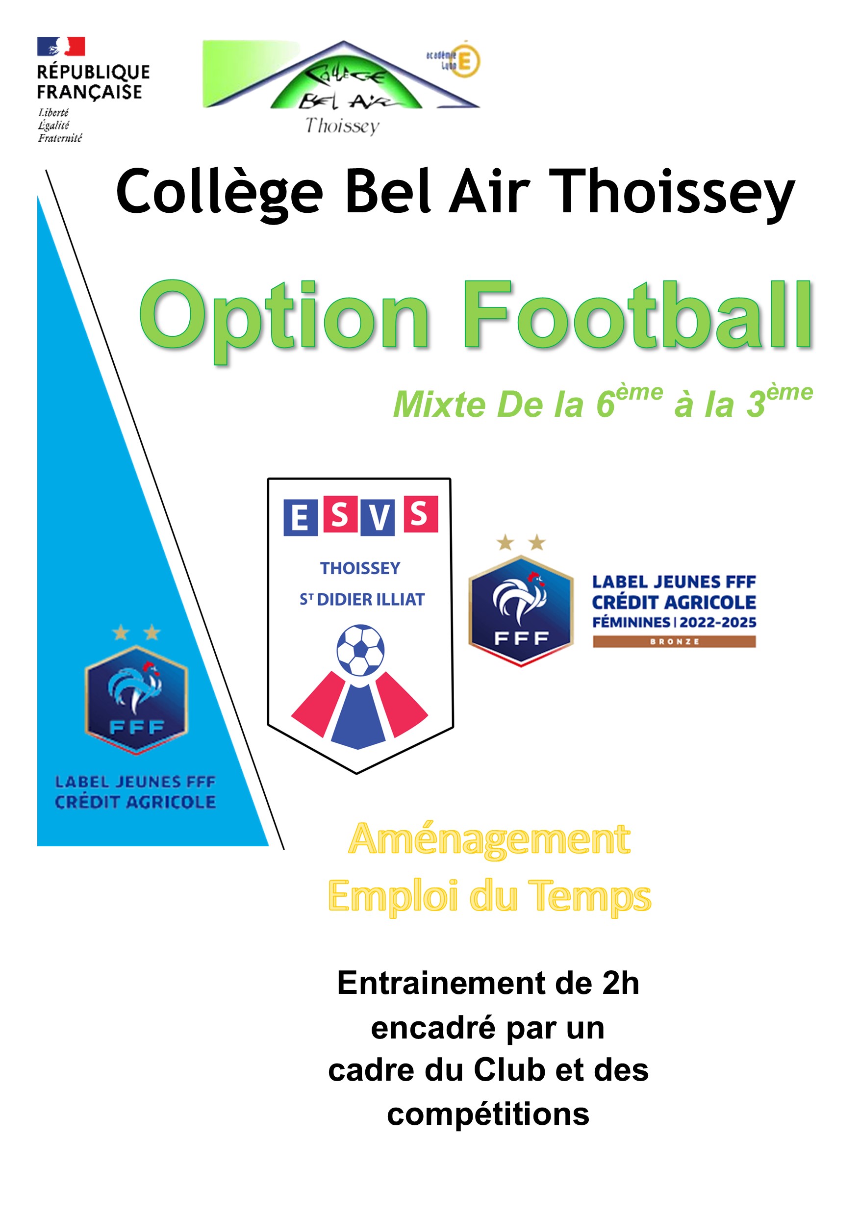 Vous trouverez ci-dessous des informations relatives à l'option FOOTBALL. Tests Option Football 2026-2027 le mercredi 27 mai 2026 : voir dossier de candidature.